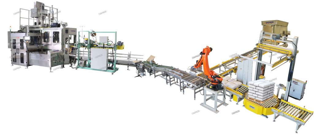 - Alimentador de saco automático consiste de 3 unidades horizontais, cada unidade pode armazenar 100 sacos (saco de PE), adequados para produção de alta velocidade.