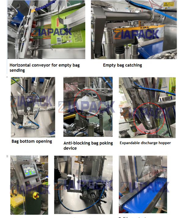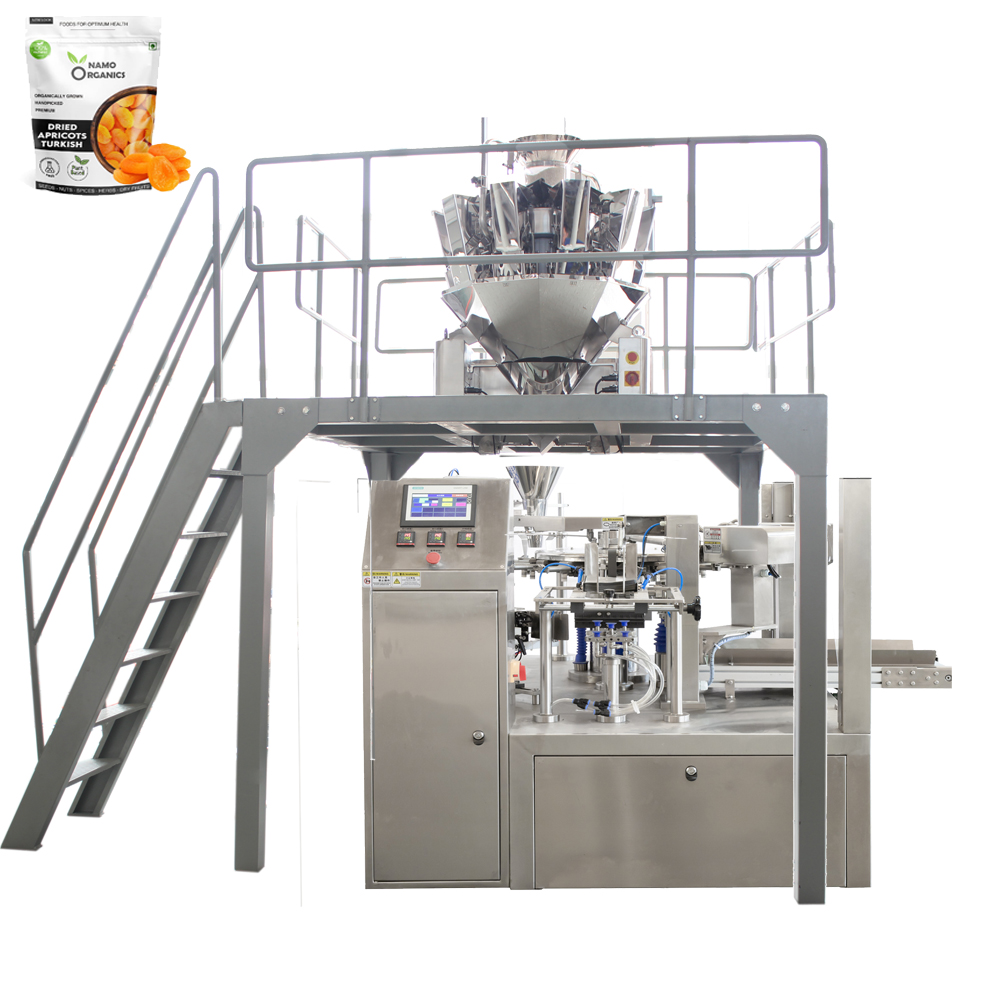 Máquina de embalagem com saco rotativo com dosagem diferente (como balança multihead, enchimento de broca, enchimento de líquido etc.) pode ser adequado para a embalagem automática para granular, pó, líquido, pasta etc. Diferentes tipos de produto com a bolsa de zíper de stand-up premade e assim por diante.
