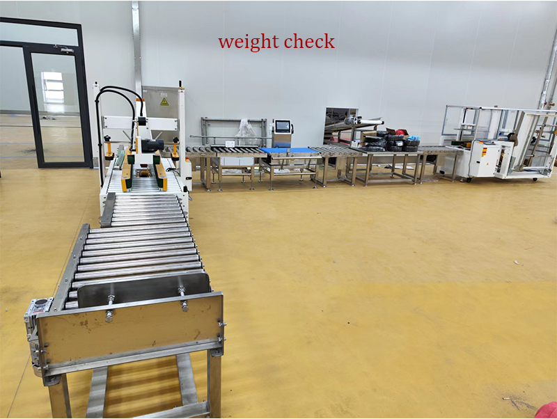 Depois de encher os sacos com alimentos congelados, cada saco é verificado novamente por um detector de peso para garantir que o peso corresponda ao peso-alvo e, em seguida, passa por um detector de metais para garantir que nenhum metal seja misturado em cada saco. Os sacos são então transportados para a linha de envase de caixas.