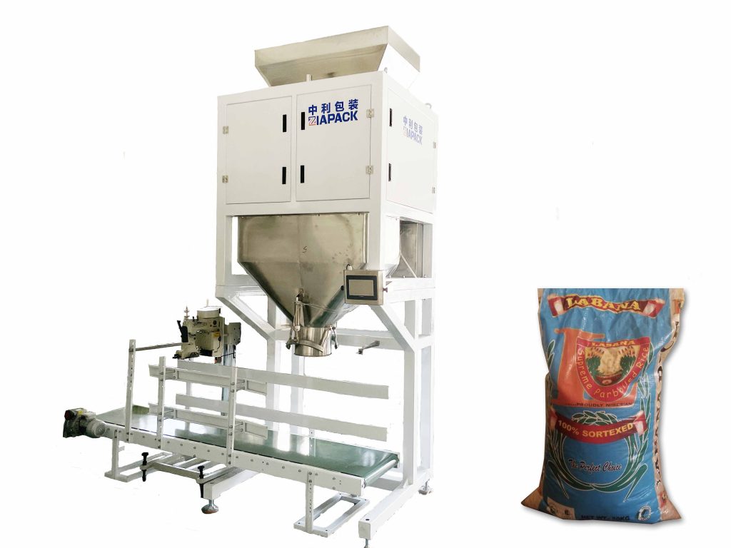 Esta unidade de máquina inclui um conjunto de máquina de pesagem de baldes duplos para medir 30-50kg. Um conjunto de transportador de saída de 3 metros, um conjunto de máquina de selagem de aquecimento de saco PE e um conjunto de máquina de costura de saco de juta. costura do saco e selagem a quente. Só precisa de alimentação manual do saco.