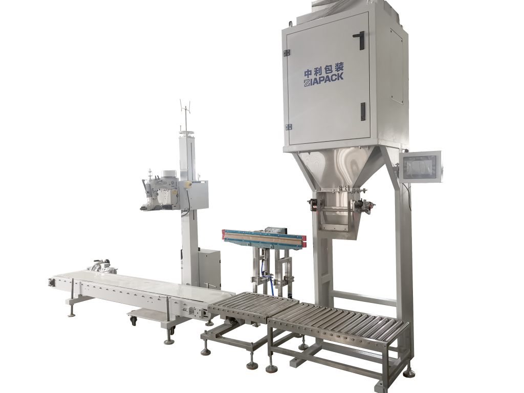 Colocação manual de saco → Enchimento automático → Pesagem automática → Transporte automático de saco → Costura / vedação automática de saco com auxílio manual.