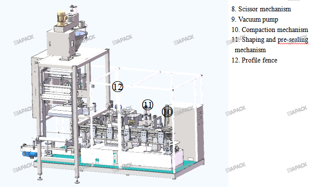 Formação de saco→colheita de saco→corte→vibração→modelagem e pré-selagem→aspiração→descarte e empurrão de saco→entrega do produto acabado